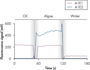 Effective differentiation of algal fluorescence from oils: The shaded regions represent sample changeover. The blue trace shows the signal optimized for algae (excitation 365 nm, emission 680 nm); the black trace shows the signal for excitation 365 nm, emission 460 nm.
