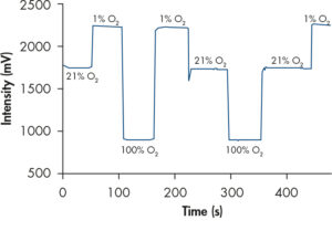 Photo: Fast and reversible signal response. The oxygen sensor was exposed to different oxygen concentrations at different time points.